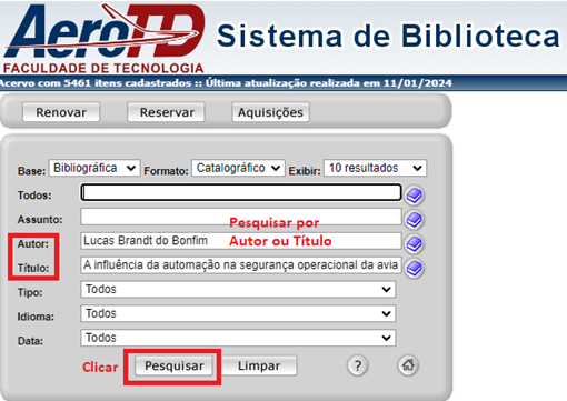 Ao clicar no endereço Biblioteca Virtual acima na tela pesquise pelo Autor ou Título do TCC depois em Pesquisar