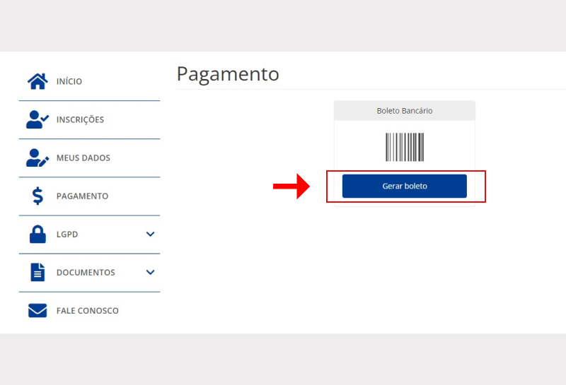 Passo 08: Clique em PAGAMENTO no menu esquerdo e depois em Gerar Boleto.