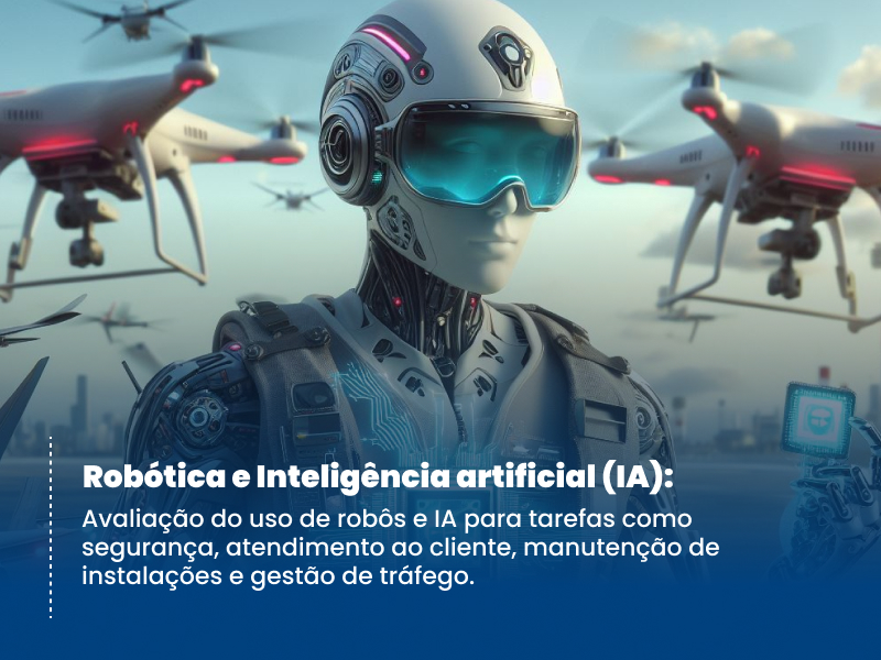 Avaliação do uso de robôs e IA para tarefas como segurança, atendimento ao cliente, manutenção de instalações e gestão de tráfego.