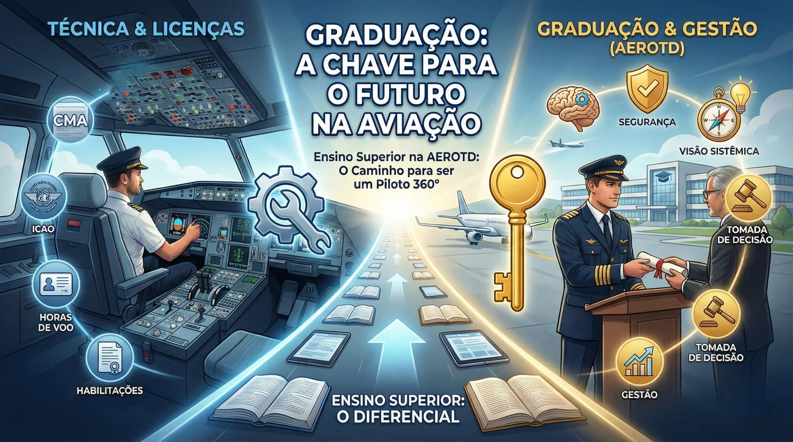 A graduação em Ciências Aeronáuticas da Faculdade de Tecnologia AEROTD foi desenhada para formar um “Piloto 360°” — alguém que não só domina a técnica, mas entende o “todo” da operação: gestão, segurança e o impacto das decisões no voo e na companhia.