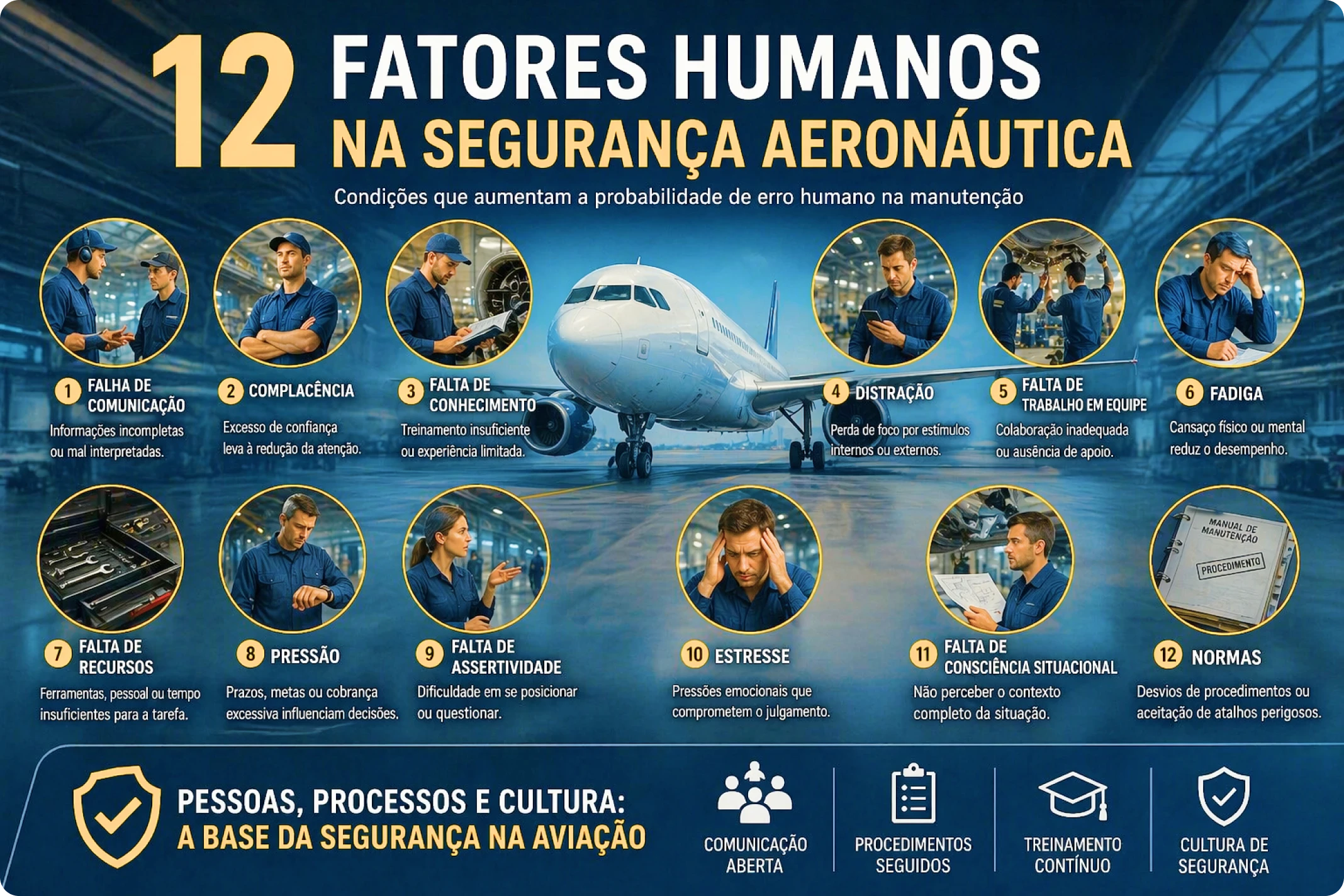 Esses elementos não são, por si só, a causa direta do erro, mas sim condições que aumentam significativamente a chance de que ele ocorra. Por isso, o Dirty Dozen é tão relevante: ele oferece uma linguagem prática e acessível para reconhecer riscos humanos no cotidiano da manutenção.